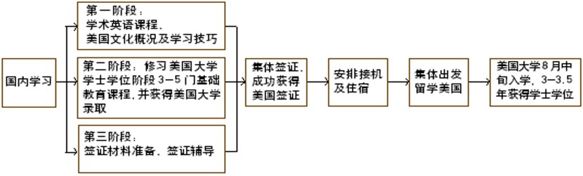 國內階段:每年2期,主要是學術英語課程培訓,最多可以修習美國大學學士學位階段5門基礎教育課程,包括商務英語、社會科學及美國研究、人文科學、多元文化、藝術美術;并成功獲得赴美留學簽證。