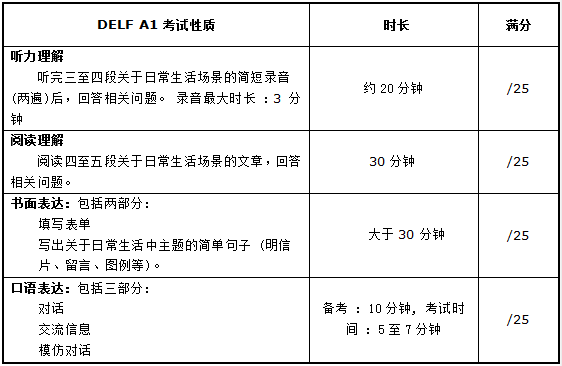 • DELF A1 對應(yīng)歐盟語言共同參考框架的A1級別,即“入門級別”。該級別能將剛開始學(xué)習(xí)的初級語言知識應(yīng)用到日常生活極為常見的場景之中:談?wù)撟约,生活的環(huán)境、認(rèn)識的人或所擁有的東西。
