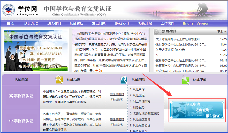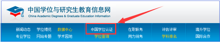 2、進(jìn)入網(wǎng)站,點(diǎn)擊導(dǎo)航欄中“中國(guó)學(xué)位認(rèn)證”。待頁面彈出后,點(diǎn)擊“認(rèn)證申請(qǐng)”。