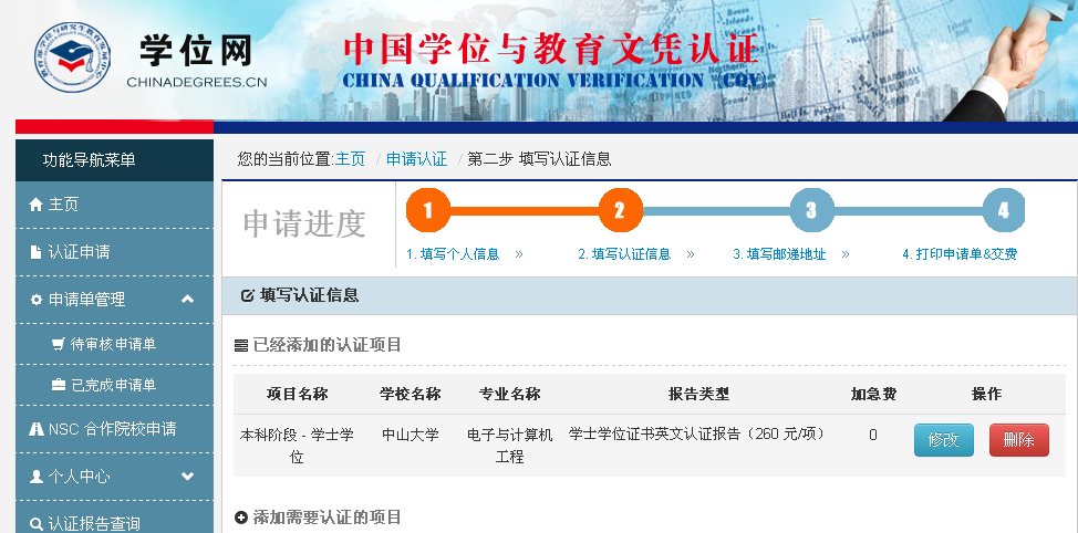 如上圖,填寫完畢,點(diǎn)擊下一步就到這里了。第一次沒有點(diǎn)擊保存,網(wǎng)頁會(huì)提醒,避免重新填寫。如果還要同時(shí)申請(qǐng)別的認(rèn)證,請(qǐng)?jiān)偬砑禹?xiàng)目,保存然后進(jìn)行下一步。