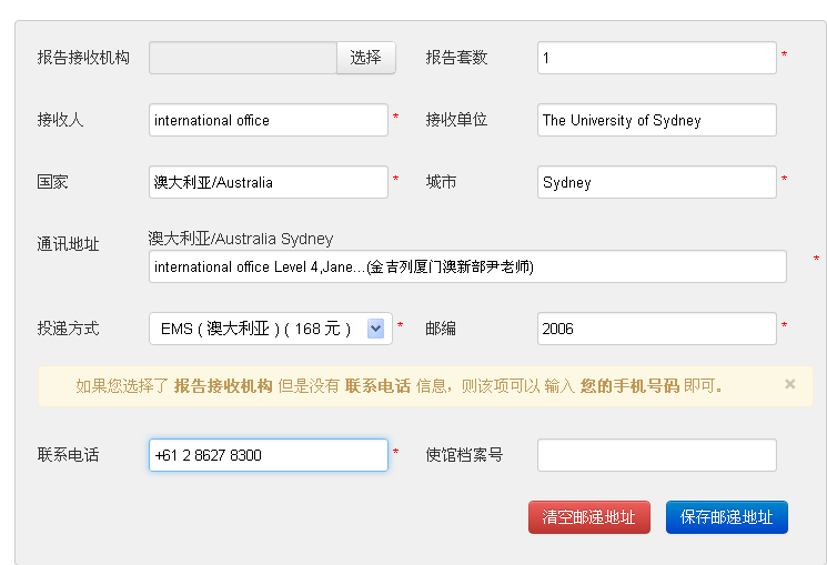 認(rèn)證報(bào)告出具以后,將直接由認(rèn)證中心郵寄至澳方大學(xué)國(guó)際辦,而不能經(jīng)由任何第三方之手,否則無效。所以該報(bào)告不用學(xué)生或家長(zhǎng)親自郵寄,但是需要填寫接收單位地址或材料。我們以澳大利亞悉尼大學(xué)為例:在這個(gè)頁面中,需要你填寫郵寄地址(請(qǐng)按照offer內(nèi)容填寫)。