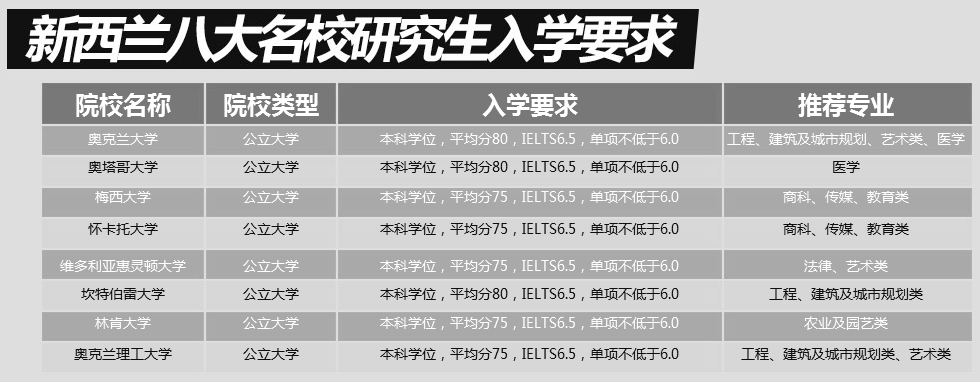 Wellington。這八所大學(xué)也是我國教育部承認(rèn)的新西蘭正規(guī)名校。能進(jìn)入以上大學(xué)攻讀碩士研究生,不僅僅是同學(xué)們終生的榮耀,而且更有利于大家將來的事業(yè)發(fā)展。接下來,我們就以圖表的方式為同學(xué)們介紹新西蘭八大名校的碩士入學(xué)條件。